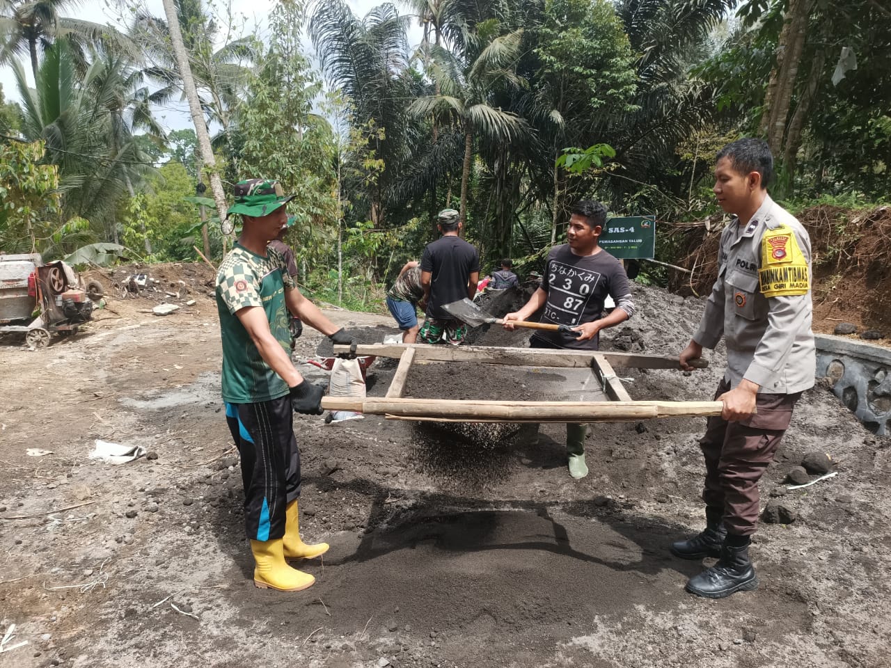 Di Dusun Kebun Baru, Desa Giri Madia, Bhabinkamtibmas bersama Babinsa ikut bergotong royong dalam kegiatan TMMD ke-126 Kodim 1606 Mataram.